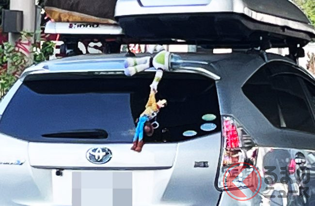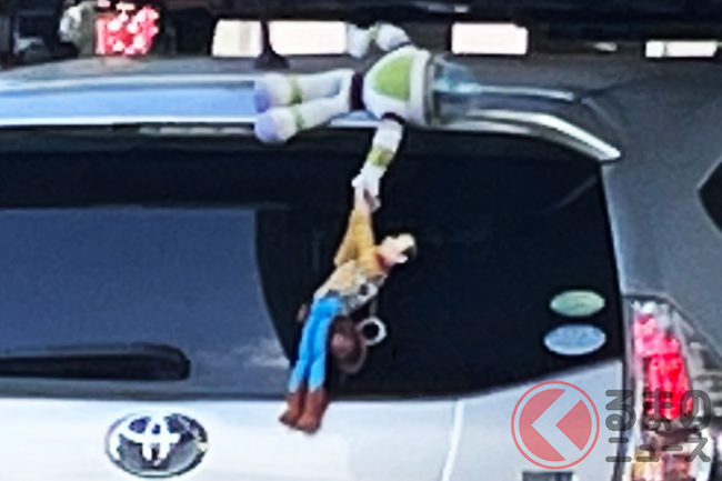 映画「トイ・ストーリー」に登場するウッディーとバズ・ライトイヤーがクルマの後方にぶら下がっている光景が話題となっています。落下する可能性もありますが、問題ないのでしょうか。