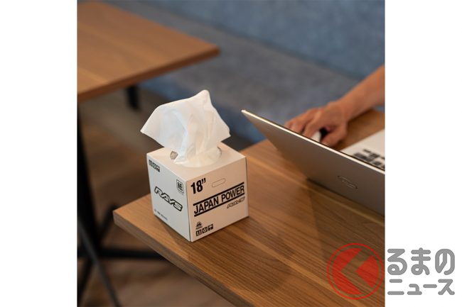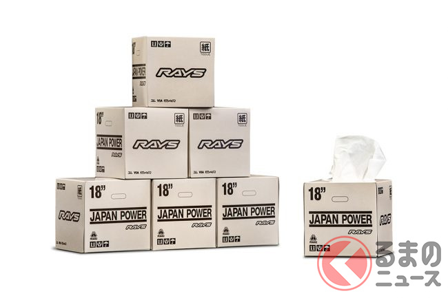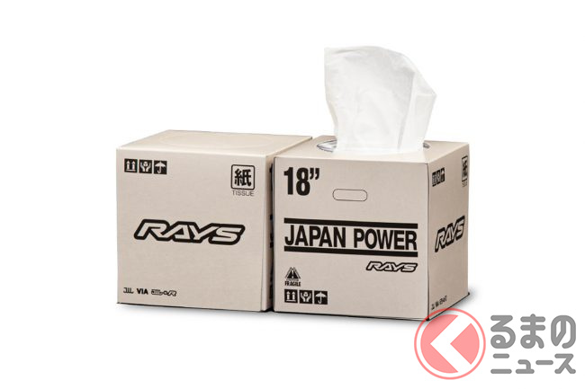 自動車用のアルミホイールなどを開発、製造する「RAYS(レイズ)」から、ホイール梱包箱をモチーフにしたボックスティッシュと両面刺繍のキータグが登場しました。