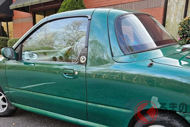 スバル「“軽”オープンカー」登場! 斬新「ぐるりんぱ窓」がスゴイ! オシャグリーン&「目がバグる」コンパクトボディ採用の「ヴィヴィオT-TOP」が米で落札