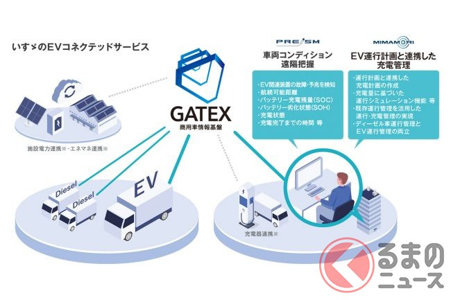 このサービスは、いすゞなどが運用する商用車情報基盤「GATEX(ゲーテックス)」を利用し、BEVを安心して使用できる「稼働サポート」および効率的な運用を支援する「充電マネジメント機能」を、運送事業者に対して提供するものです。各国市場にも順次展開する予定です。