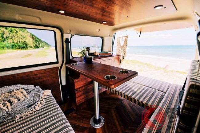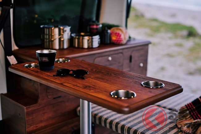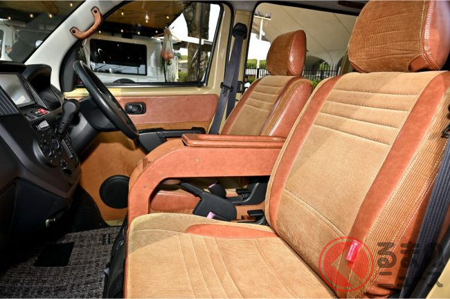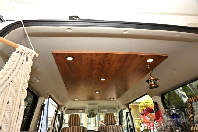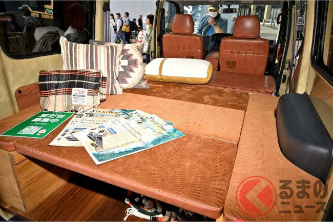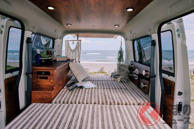 内装は、後部荷室にはフラットベッド装備され、車中泊も可能な仕様となっています。また、シート部分は明るめのベージュで統一しています。
