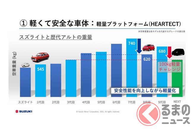 スズキは次期「アルト」の開発について技術戦略説明会で言及しました。現行モデルからさらに100kgの軽量化を目指すと宣言したのですが、一体どのようなモデルになるのでしょうか。