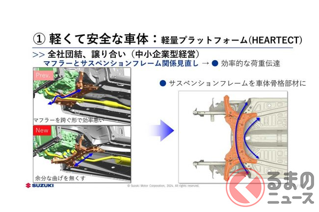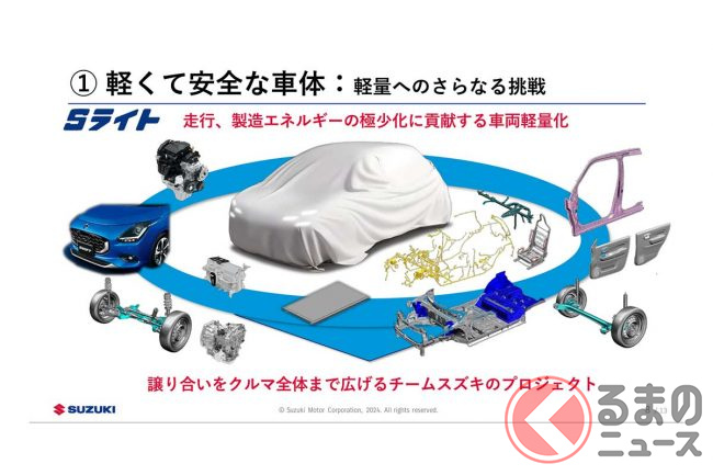 スズキは軽量化に関してパワーユニット部門やシャシ部門を超えての責任者を用意し、クルマ造り全体で軽量化を目指せるような開発メンバー構成にしているようです。