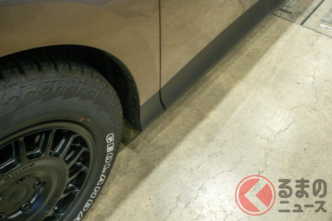 まず、通常は大径ホイールとオンロードタイヤが備わる足回りを、オフロードタイヤ付きのブラックホイールに換装。