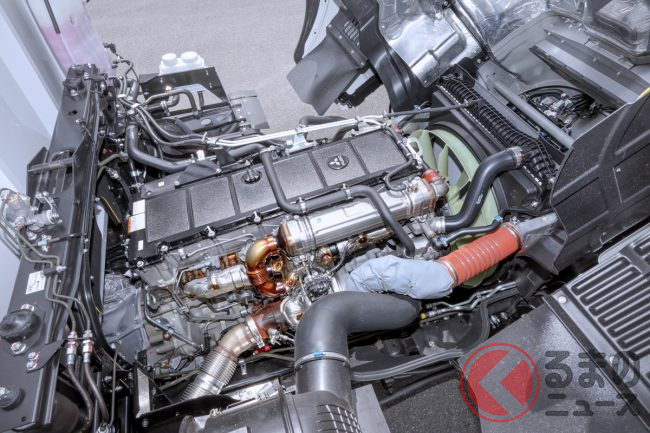 排気量の追加で低速トルクが増大したため、大型トラックに求められる力強さを実現したいっぽう、燃費性能も向上。「2025年度重量車燃費基準(JH25モード)にも適合しています。