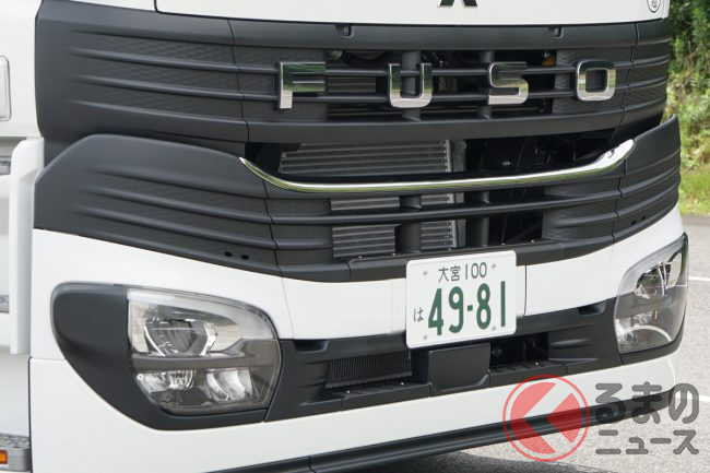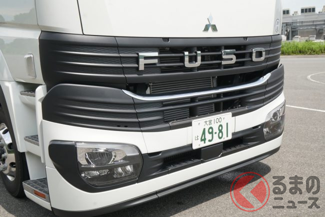 まず目を引くのは大きくイメージを変えたフロントマスクです。キャビンは従来の形状を踏襲していますが、フロントには、かつての三菱ふそうの大型トラック「Fシリーズ」や「ザ・グレート」をほうふつとさせる「ブラックベルト」を新たに採用。基本的に無塗装の樹脂とすることで、パーツ製造時のCO2を削減しています。