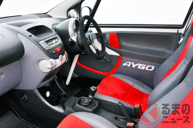 車内はロールケージが張り巡らされ、全幅は185mmもワイド化。ブレーキはフロントにブレンボ製の4ポットキャリパーがおごられ、足元には225サイズの17インチタイヤが備わるなど、見た目以外はアイゴの面影が皆無という仕上がりでした。