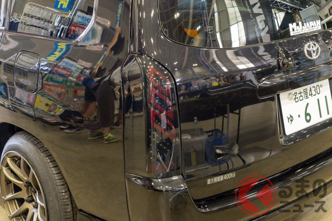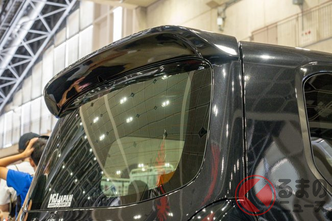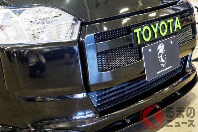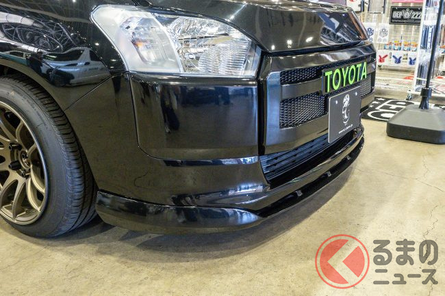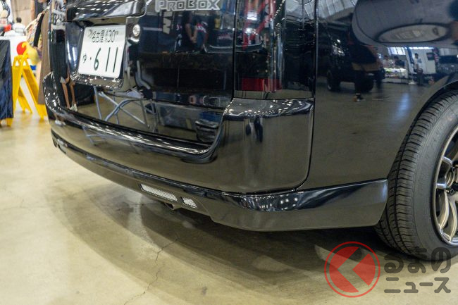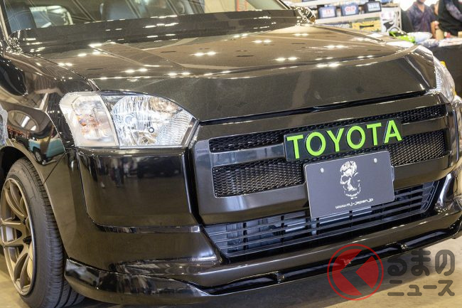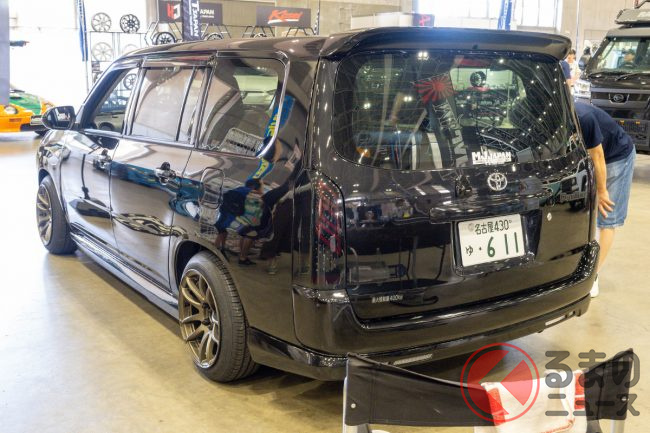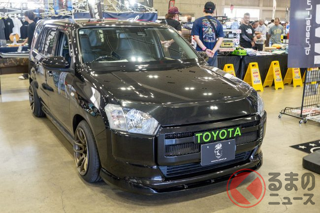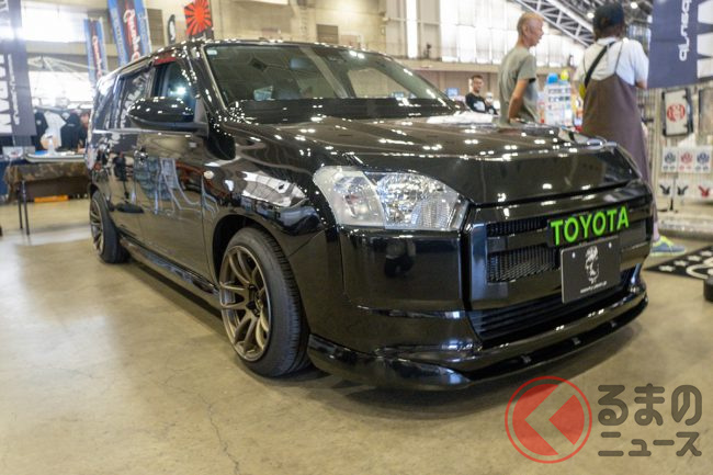トヨタ「プロボックス “スポーツ”」初公開!? 黒すぎる「ちょい悪フェイス」に「巨大スポイラー」装備の「商用バン」! 存在感スゴい「専用カスタム」仕様を披露