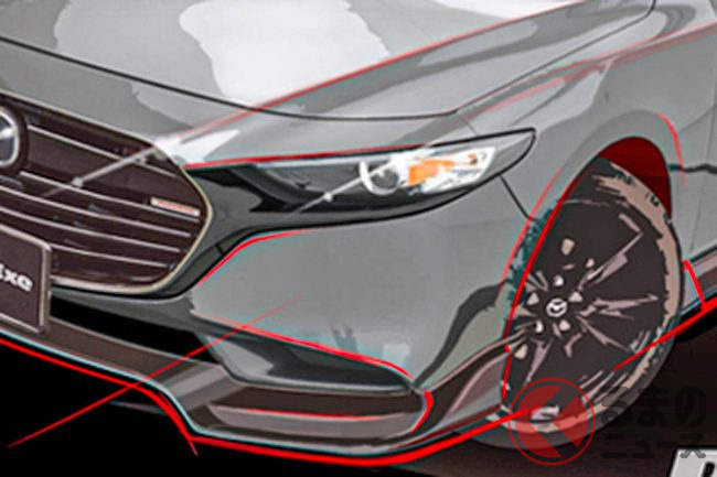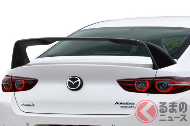 マツダ新型「スポーティ“セダン”」公開!? 迫力“リアスポ”装備の「BP-07」! 精悍エアロ仕様の「マツダ3」受注開始