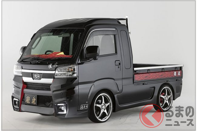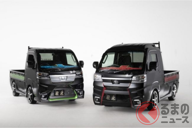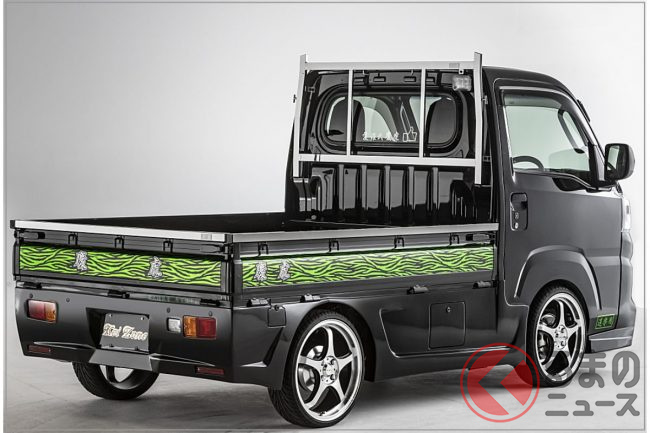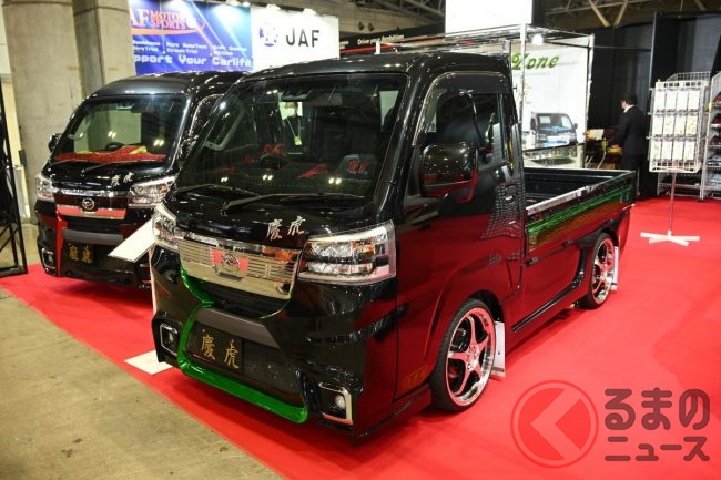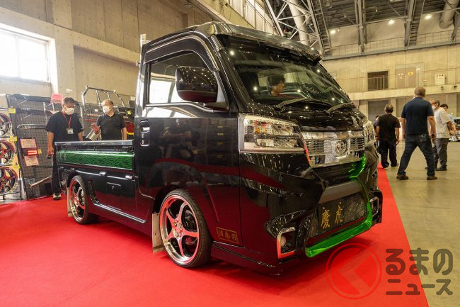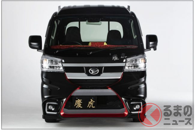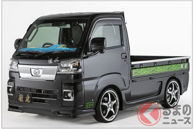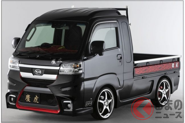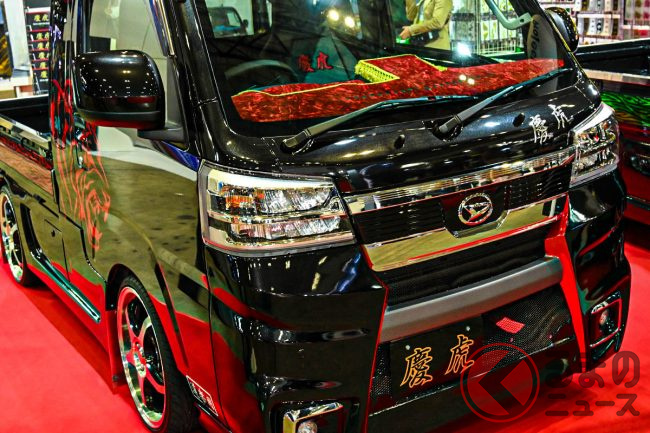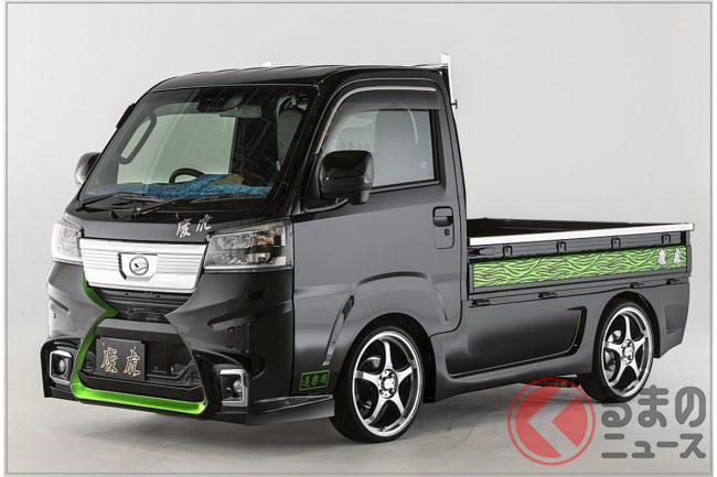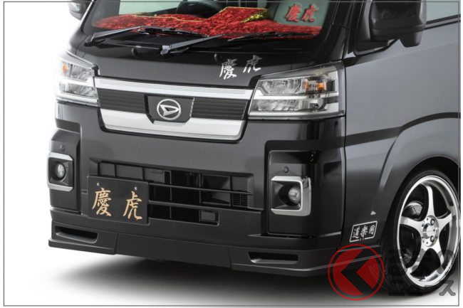 ダイハツ「斬新“コワモテ”軽トラ」公開! 超イカツい「凄顔カスタム」に「鮮烈ライムグリーン」の「働くクルマ」! 強烈すぎる存在感の「慶虎」とは