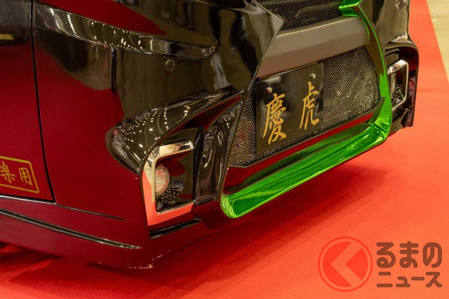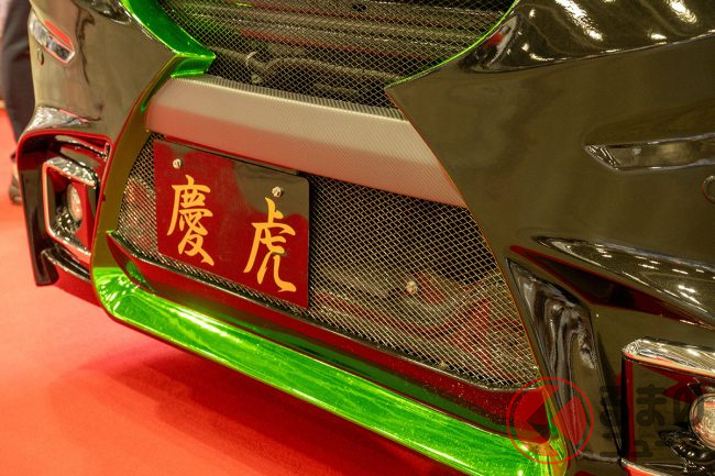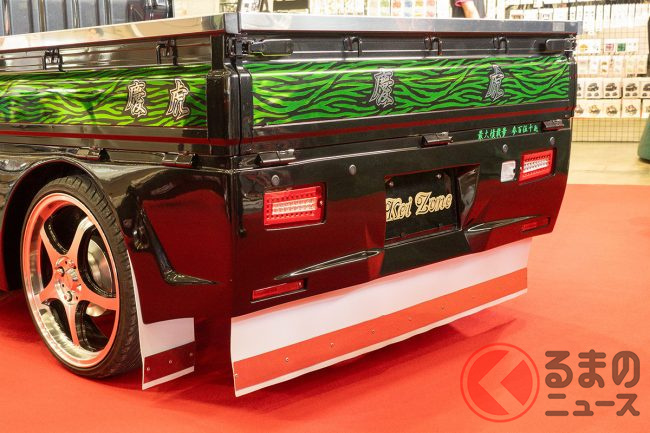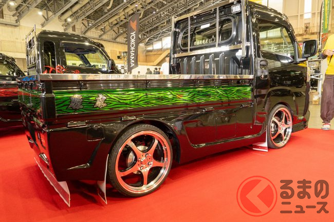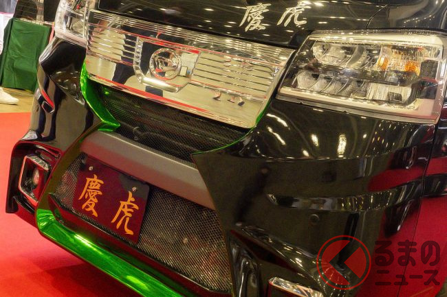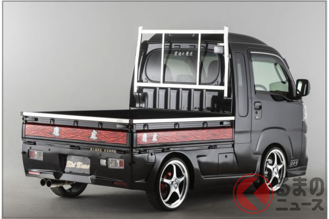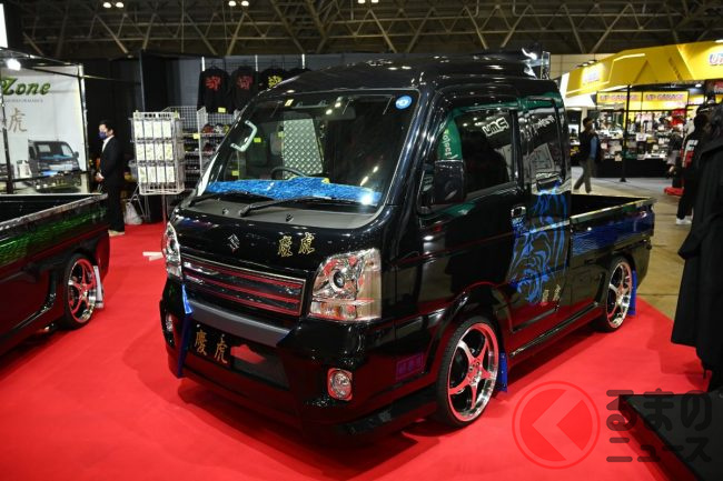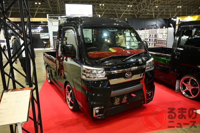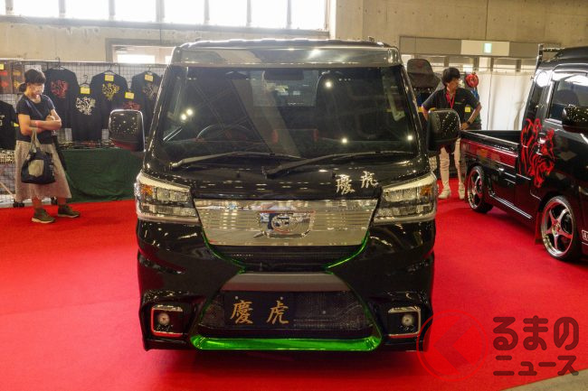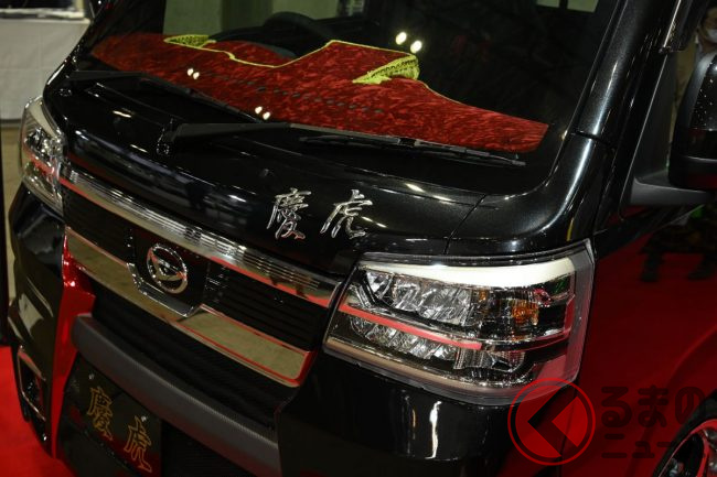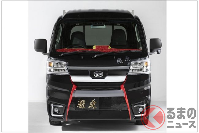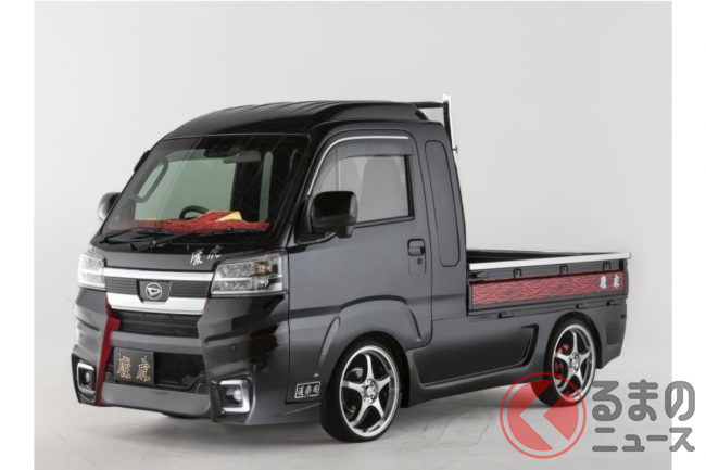 ダイハツ「斬新“コワモテ”軽トラ」公開! 超イカツい「凄顔カスタム」に「鮮烈ライムグリーン」の「働くクルマ」! 強烈すぎる存在感の「慶虎」とは
