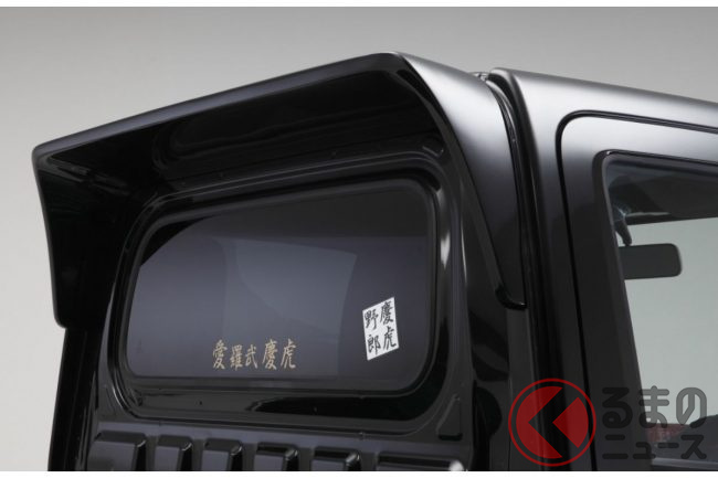 ルーフにはバイザーを装着し、デコトラのような存在感を与えるとともに、リアウインドウには「愛羅武慶虎(アイ・ラブ・ケイトラ)」のゴールドステッカーを貼付し、ワンポイントのアクセントを付与しました。