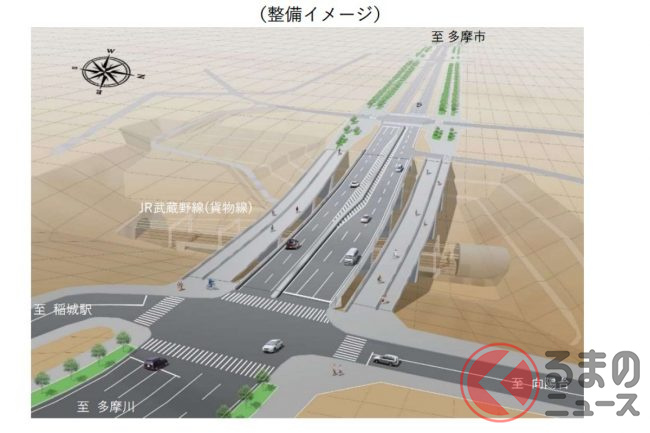 ここに4車線の本線道路が開通すれば、パンク状態だった現在の側道からは、交通容量が大幅に改善されることとなります。また混雑の目立つ鎌倉街道との交点「多摩卸売市場前」交差点は立体化され、信号待ちが無くなります。