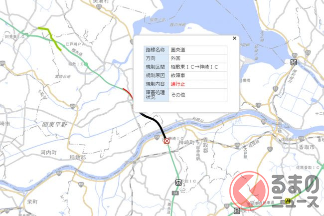 8月20日午前10時より、圏央道の稲敷東IC~神崎IC間が通行止めとなっています。どのような状況なのでしょうか。