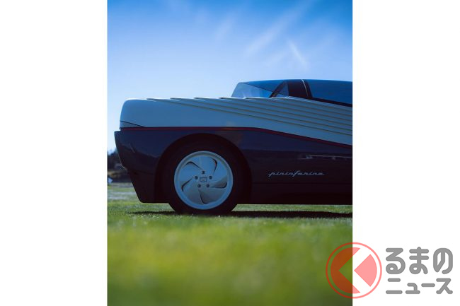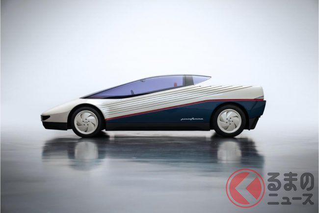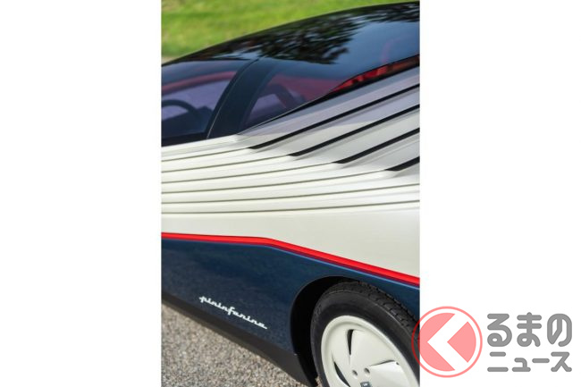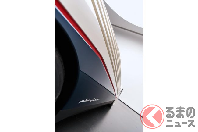 ボディカラーはホワイト×ネイビーのファッショナブルなもので、サイドからリアにかけては赤いアクセントラインを、ロアにはピニンファリーナのロゴをそれぞれ施すなど、先進的かつ斬新な意匠も取り入れられています。