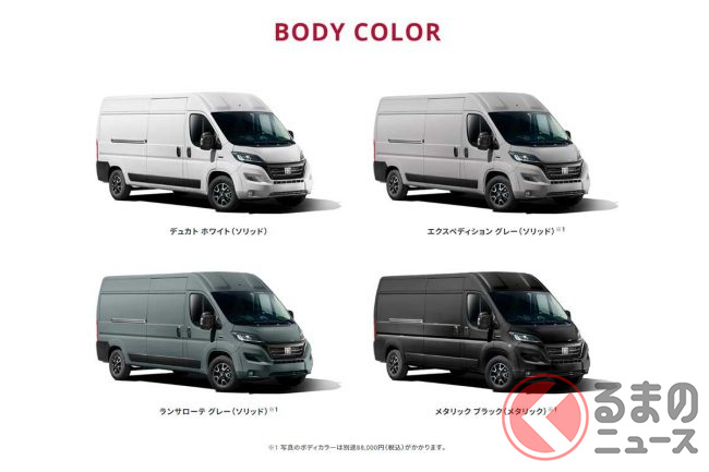 ボディカラーは標準色「デュカト ホワイト」のほか、「エクスペディション グレー」「ランサローテ グレー」「メタリック ブラック」の各オプションカラー(+8万8000円)を設定します。