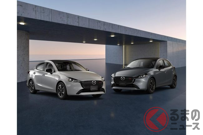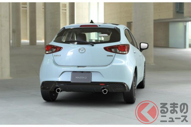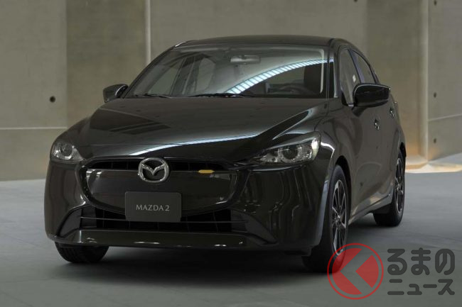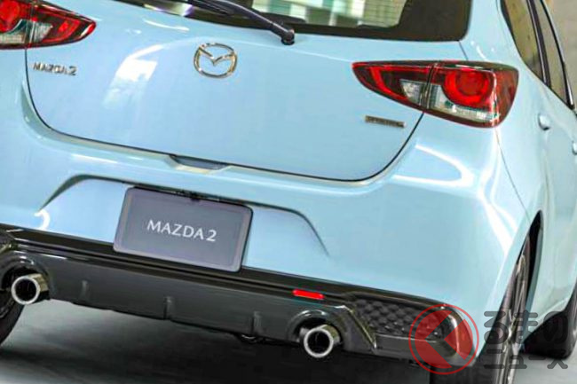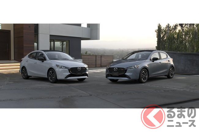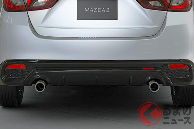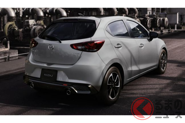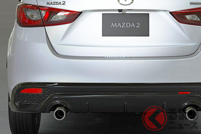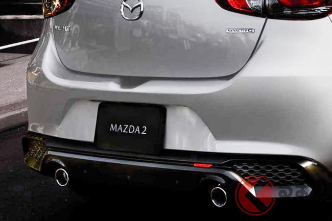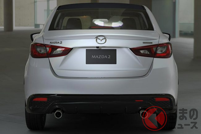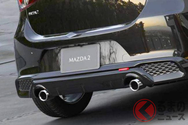 新型「マツダ2」公開! “2リッターエンジン”×ツインマフラー仕様アリ! 安全装備アップデートの「ハッチバック&セダン」“黒感”も増して墨で登場