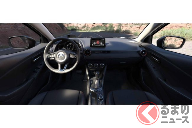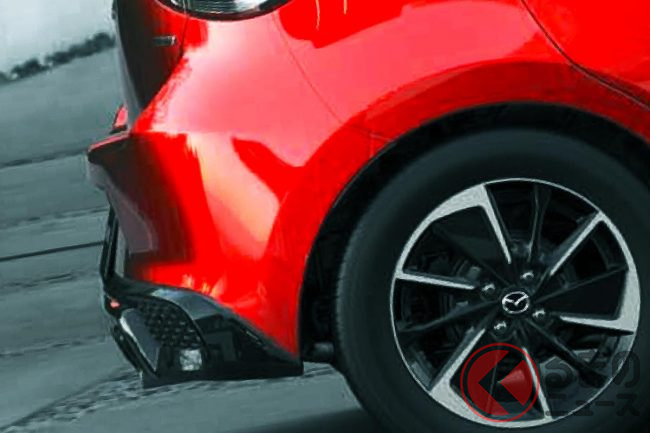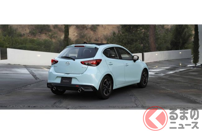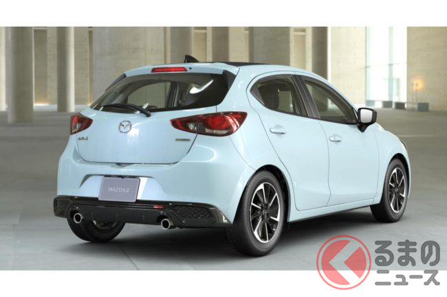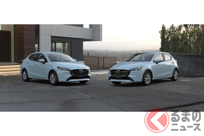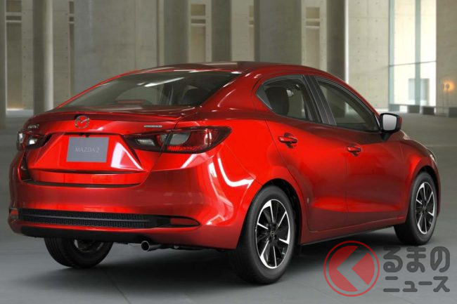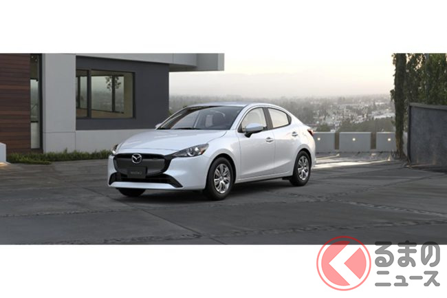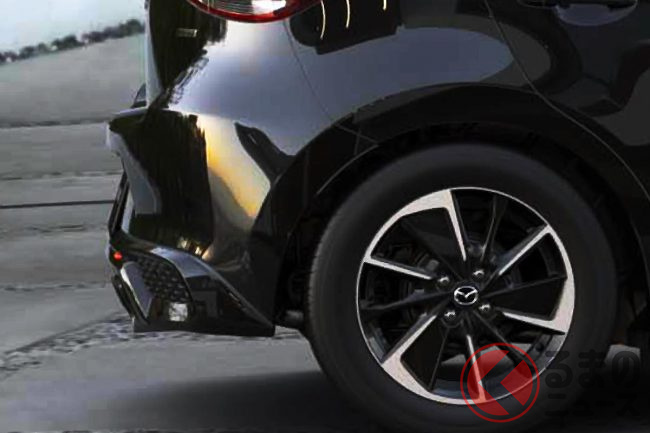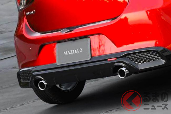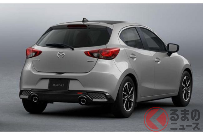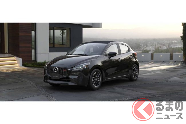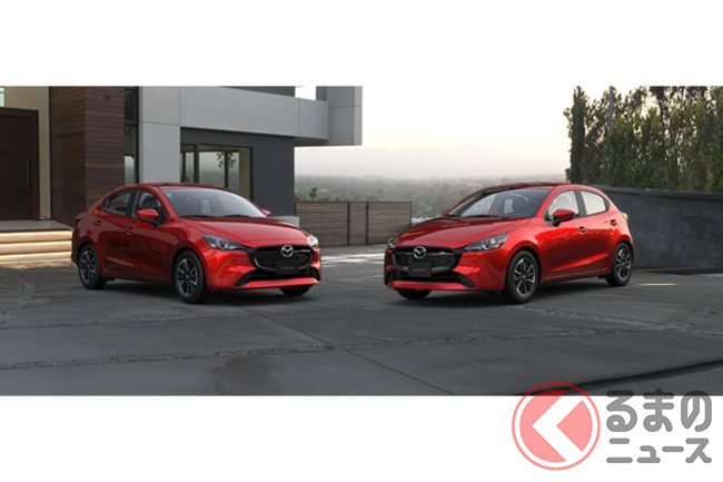 新型「マツダ2」公開! “2リッターエンジン”×ツインマフラー仕様アリ! 安全装備アップデートの「ハッチバック&セダン」“黒感”も増して墨で登場