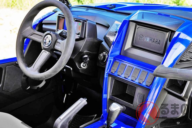 インテリアは乗用車風のインパネやマットアルミの加飾パネル、ヤマハブルーのイルミネーション、ヤマハブルーのカットアンドソーシートを備え、ATVとしては極めて豪華な空間としています。