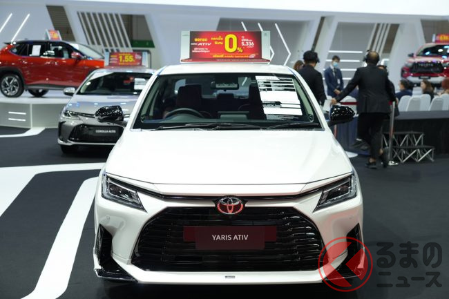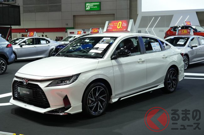 「カローラ」より小さい! トヨタ「“最新型”小型セダン」実車展示! 斬新“大口顔”に「豪華内装」の「ヤリスA」! 全長4.4m級の「上質コンパクト」タイで披露