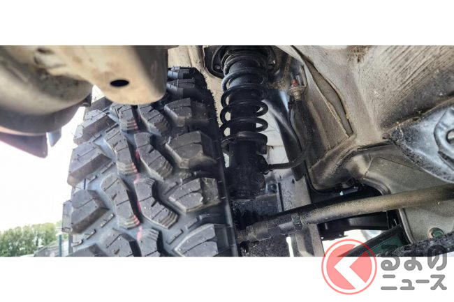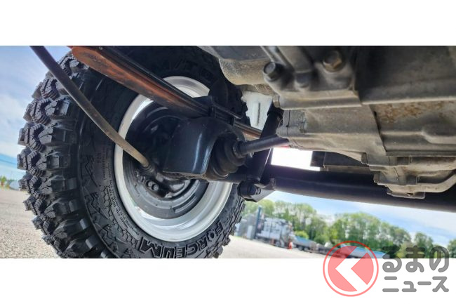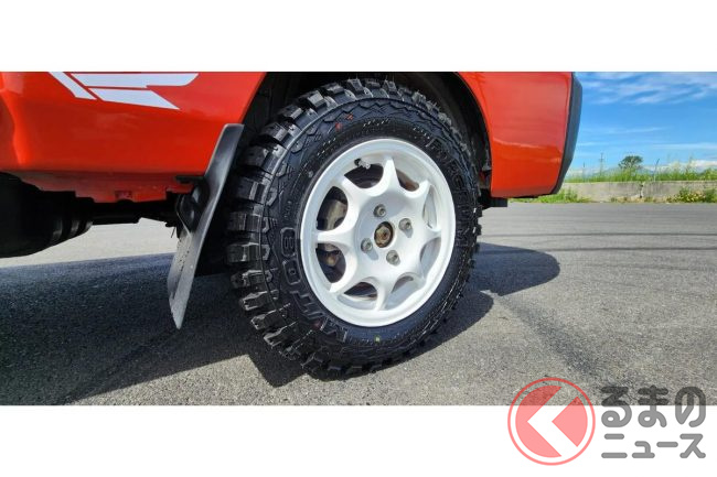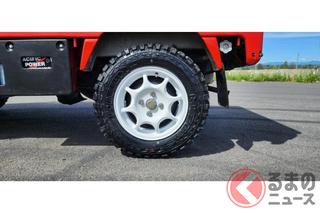 一方で、米国に渡ってからは現地のオーナーにカスタムされたのか、タイヤは165/80 R13サイズのFORCEUM製「M/T 08 PLUS」オフロードタイヤと、メーカー名は不明ですが、社外品のホワイトのアルミホイールを履いています。