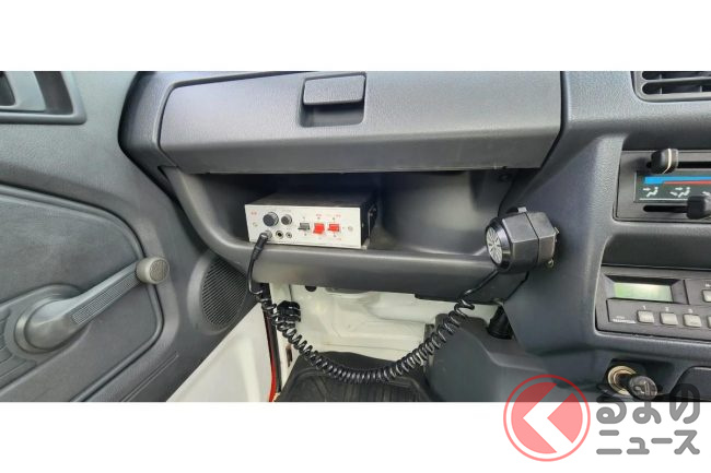 屋根にはそのままパトライトが装備され、車内には消防車用のサイレンアンプ「TSK-312N」までもがそのまま残されています。