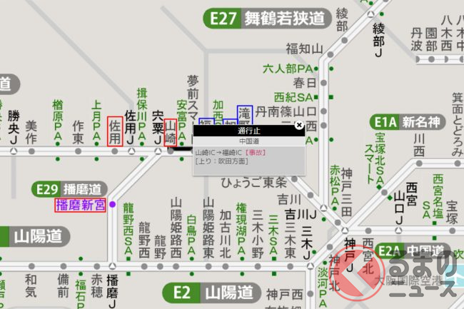 2024年8月27日14時45分より、兵庫県の中国道上り線(東行き)の山崎IC→福崎ICで車両火災のため通行止めが実施されました。