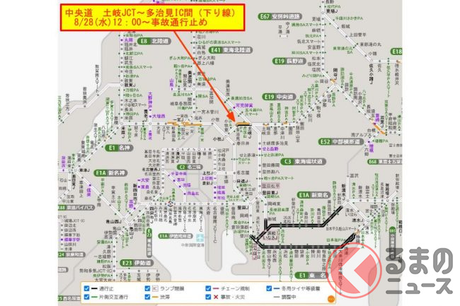 2024年8月28日正午より、中央道下り土岐JCT→多治見ICが突破事故のため通行止めになっています。