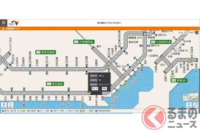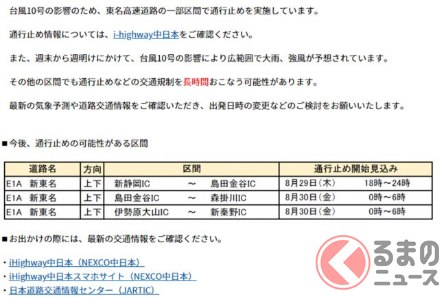 台風10号の接近にともない、2024年8月29日18時から東名高速上下線の静岡IC~焼津ICが通行止めとなりました。このほか、新東名高速などでも通行止めが予定されています。
