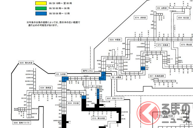 また、NEXCO西日本も以下の区間で通行止めの可能性を示しています(いずれも30日6時~12時開始)