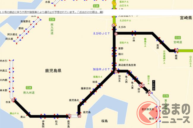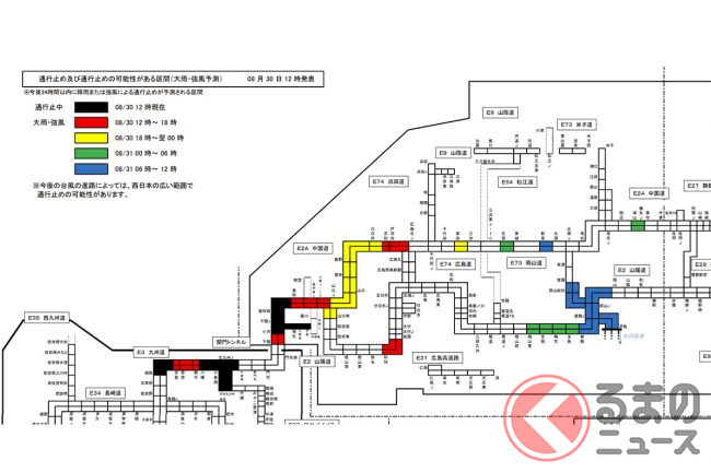 台風10号接近の影響で、2024年8月30日12時現在、全国の高速道路で通行止めとなっています。