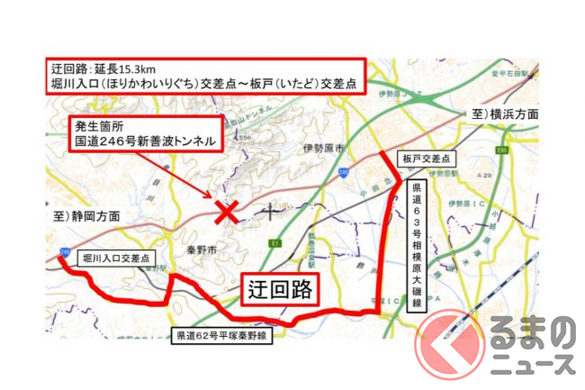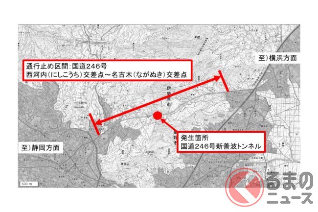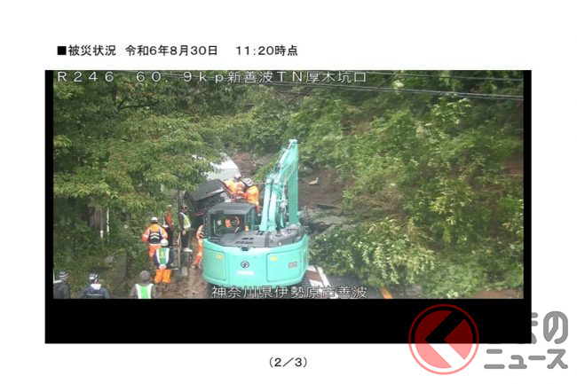 「すごい土砂災害…」 国道246号が「通行止め」! 伊勢原~秦野市境が「封鎖中」 新善波トンネルで法面崩落発生 周辺道路は混雑 神奈川