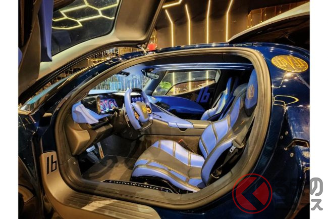 エクステリアは、巨大な形状とバタフライドアが特徴的でありながら、フロントフェンダー付近に「16」の文字がデザインされています。