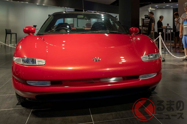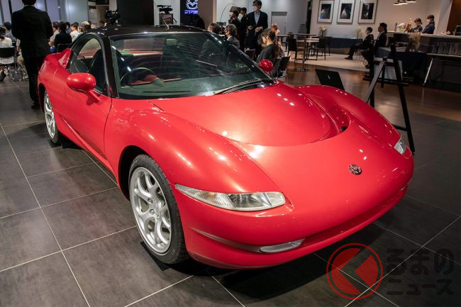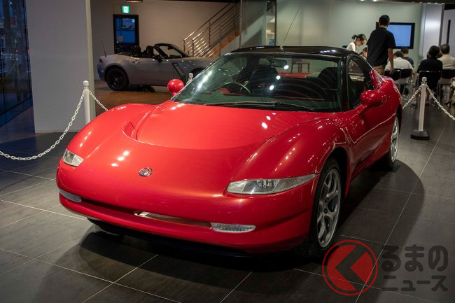 マツダ「ロータリー”スポーツカー”」公開に反響多数! ツルツルボディの斬新フォルムに「スゴイ」の声も! 幻の「RX-7」後継モデルが東京に登場
