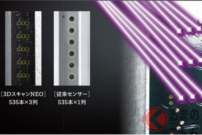 このシステムは、535本のセンサーラインに加え、3列同時発光の広角型センサーラインを搭載しており、水しぶきや湯気に影響されない高精度な車形認識が可能となり、風の強い日や冬期の温水洗車による湯気が発生しやすい日でも、外的環境を問わず装備品の装着位置を検出し、高品質な洗車を行うといいます。