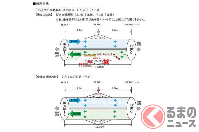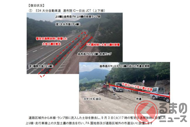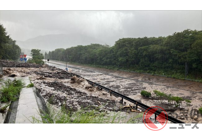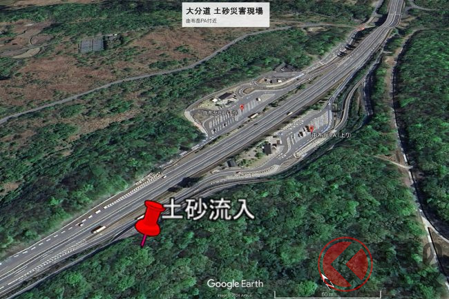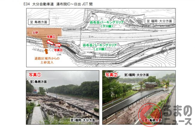大分道では湯布院IC~日出JCTの上下線で、隣接する由布岳PA(上り線)出口近くの斜面が崩れたことで、土砂が本線にまで流れ込み、路面が完全に覆われて通行できなくなっていました。