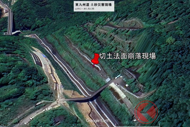 一方、東九州道は臼杵IC~津久見ICの大分方面へ向かう上り線沿線の斜面にある切土法面が崩落。現在のところ本線は支障していませんが、大規模な崩落があれば甚大な被害に及ぶ可能性がある状態です。