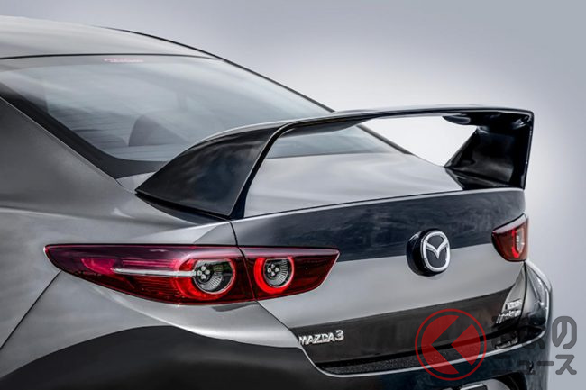 マツダ斬新「スポーティ“セダン”」に大反響! めちゃ「巨大ウイング」&精悍フルエアロ! 「マツダ3」が進化した「BP-07」に熱視線!