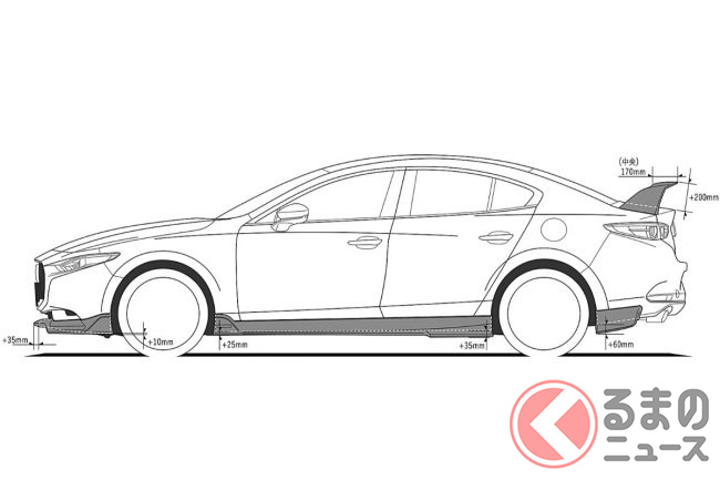 今回発表された「BP-07」は、2019年にデビューしたマツダのコンパクトセダンであるマツダ3セダンをベースに、「見た目は大胆、中身はしたたか」をテーマのもと、エクステリアのデザインを強化し、マツダ3セダンの存在感をさらに高めるチューニングを施しました。