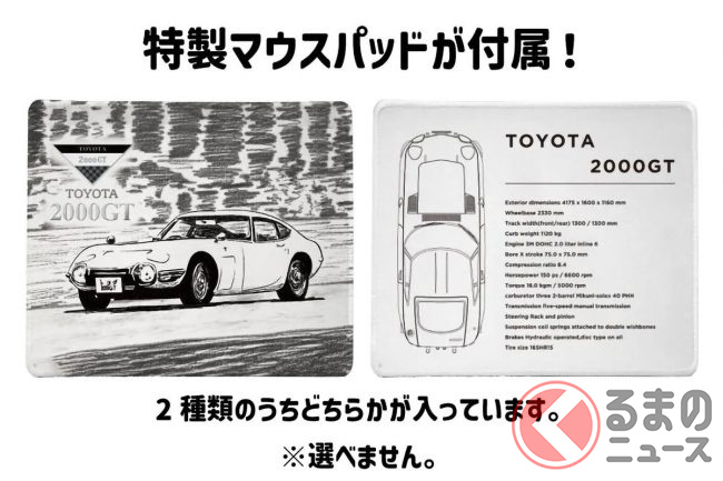 生産数は、2000個限定で2000GTの世界観を更に楽しめるマウスパッドは2種類のうちいずれか1枚がパッケージに入ります。