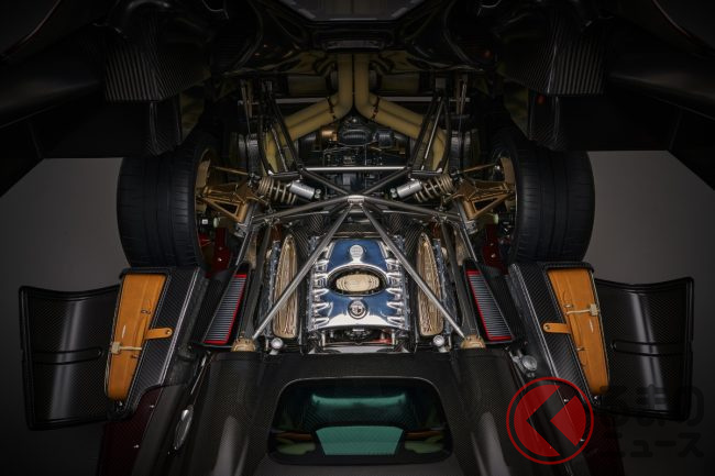 エンジンは、パガーニのためにメルセデスAMGが手掛けた6リッターV型12気筒DOHCエンジンをミッドに搭載。最高出力864馬力・最大トルク112.2kgmを発揮します。