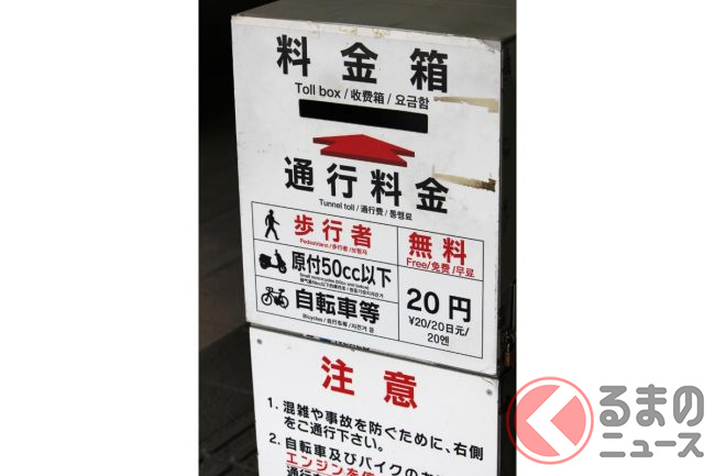 自転車や原付で通る場合は20円がかかり、トンネル内を押して歩きます。つまり、自転車などに乗ったままトンネルを通ることはできません。