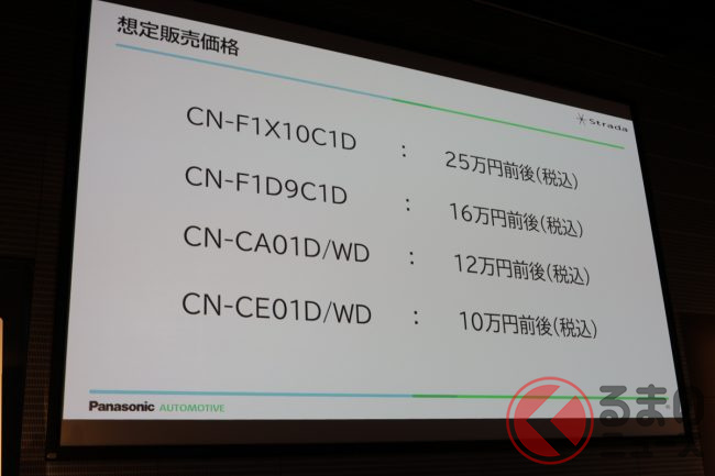 10V型有機ELフラッグシップモデル「CN-F1X10C1D」が25万円前後(消費税込み、以下同)、9V型大画面モデル「CN-F1D9C1D」が16万円前後、7V型スタンダードモデルの200mmワイドタイプ「CN-CA01WD」および180mmサイズの「CN-CA01D」が12万円前後、同7V型スタンダードモデルの200mmワイドタイプ「CN-CE01WD」および180mmサイズの「CN-CE01D」が10万円前後です。