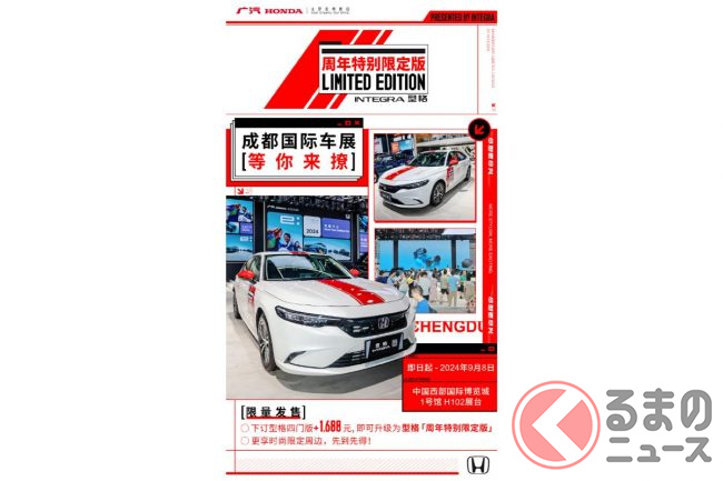 ホンダと広州汽車の中国合弁会社 広汽ホンダは、「成都国際モーターショー」(会期8月30日〜9月8日)に「インテグラ」の新たな特別仕様車「リミテッドエディション」を出品しました。どのようなモデルなのでしょうか。