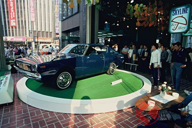 日本自動車博物館に展示されていたのは、4代目スカイライン(C110型)の2ドアハードトップモデル「2000GT-X」。