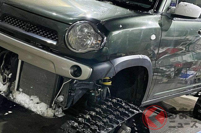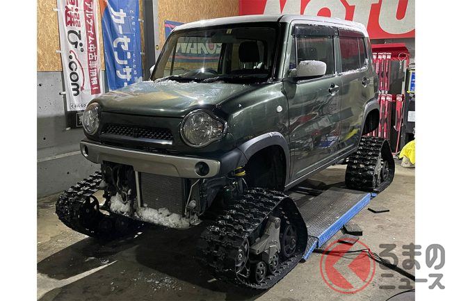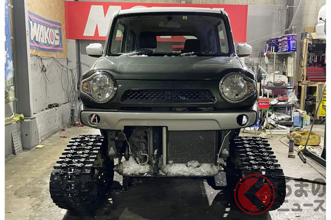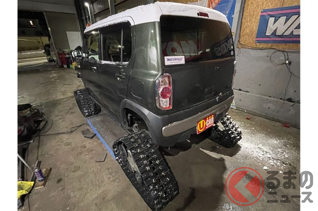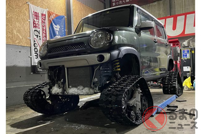 悪路で最強すぎるスズキ「軽SUV」発見!? 4輪を“キャタピラー”に換装した驚愕のスタイルに! 「スゴいハスラー」の正体は?