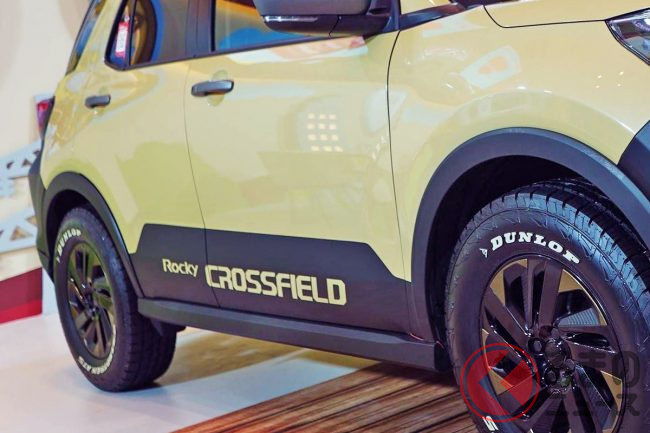 ボディサイドはグレーのドアミラーとドアハンドルを装着したほか、ドア下部には「Rocky CROSSFIELD」のロゴ入りのデカールをあしらい。さらに足回りもホワイトレター入りのオールテレーンタイヤを装着するなど、一気にタフな印象へと引き締めています。