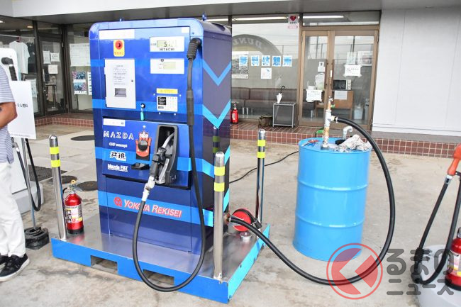 これはスーパー耐久レースでマツダだけなく、トヨタ、スバル、ホンダ、日産などメーカーの垣根を超えた「共挑(きょうちょう)」という取り組みのひとつで、今回はドラム缶で筑波サーキットに持ち込まれて、災害時にも使用できる移動式給油機で横田瀝青(れきせい)興業製の「どこでもスタンド」を使って給油されます。