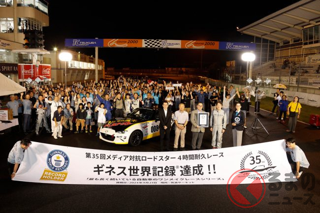 マツダが特別協賛している「メディア対抗ロードスター4時間耐久レース(メディア4耐)」が2024年9月21日に筑波サーキット(茨城県下妻市)で開催されました。新車両の導入やカーボンニュートラル燃料の使用などのトピックスだけでなく、ギネス世界記録達成も兼ねた記念すべき大会となりました。