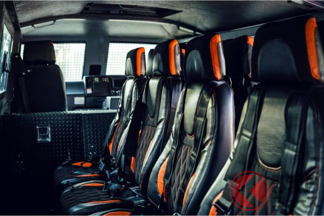 広い車内は、インパネこそFシリーズのものを流用していますが、鉄板が張り巡らされており、特殊な設計。地上レーダーやサーマルカメラなど特殊システムも搭載できます。
